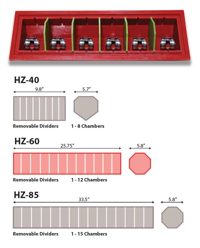 The HZ-60 Centrifugal Barrel Finisher comes with four 25.75” barrels featuring removable lids secured with cam locks for safe, efficient operation. An air-driven cover lift, controlled by a toggle switch on the control panel, allows easy removal of the barrel covers. Each barrel includes 11 divider slots, enabling the use of optional dividers to create up to 12 individual chambers per barrel. This allows operators to separate parts within each barrel, helping prevent part-on-part impingement & ensuring consistent, damage-free finishing.